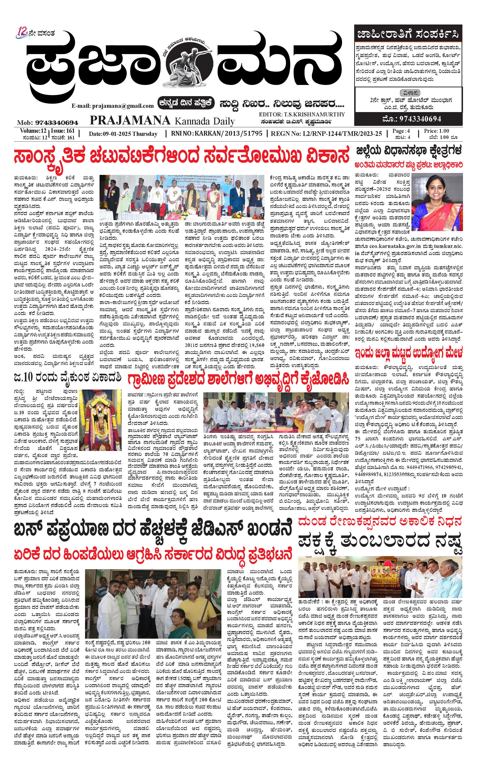 ಪ್ರಜಾಮನ 9 JANUARY 2025 January 09, 2025 << First << 1 >> Last >> Page 1Page 2Page 3Page 4 × ಪ್ರಜಾಮನ 9 JANUARY 2025 PRAJAMANA-page-001PRAJAMANA-page-002PRAJAMANA-page-003PRAJAMANA-page-004 << First << 1 >> Last >> PRAJAMANA-page-001PRAJAMANA-page-002PRAJAMANA-page-003PRAJAMANA-page-004 PRAJAMANA-page-001