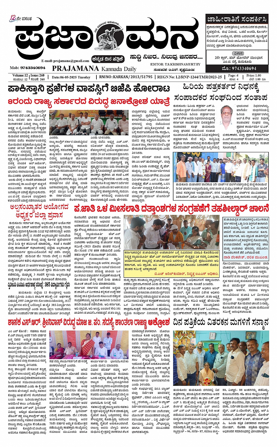 ಪ್ರಜಾಮನ 6 MAY 2025 May 06, 2025 << First << 1 >> Last >> Page 1Page 2Page 3Page 4 × ಪ್ರಜಾಮನ 6 MAY 2025 PRAJAMANA-page-001PRAJAMANA-page-002PRAJAMANA-page-003PRAJAMANA-page-004 << First << 1 >> Last >> PRAJAMANA-page-001PRAJAMANA-page-002PRAJAMANA-page-003PRAJAMANA-page-004 PRAJAMANA-page-001