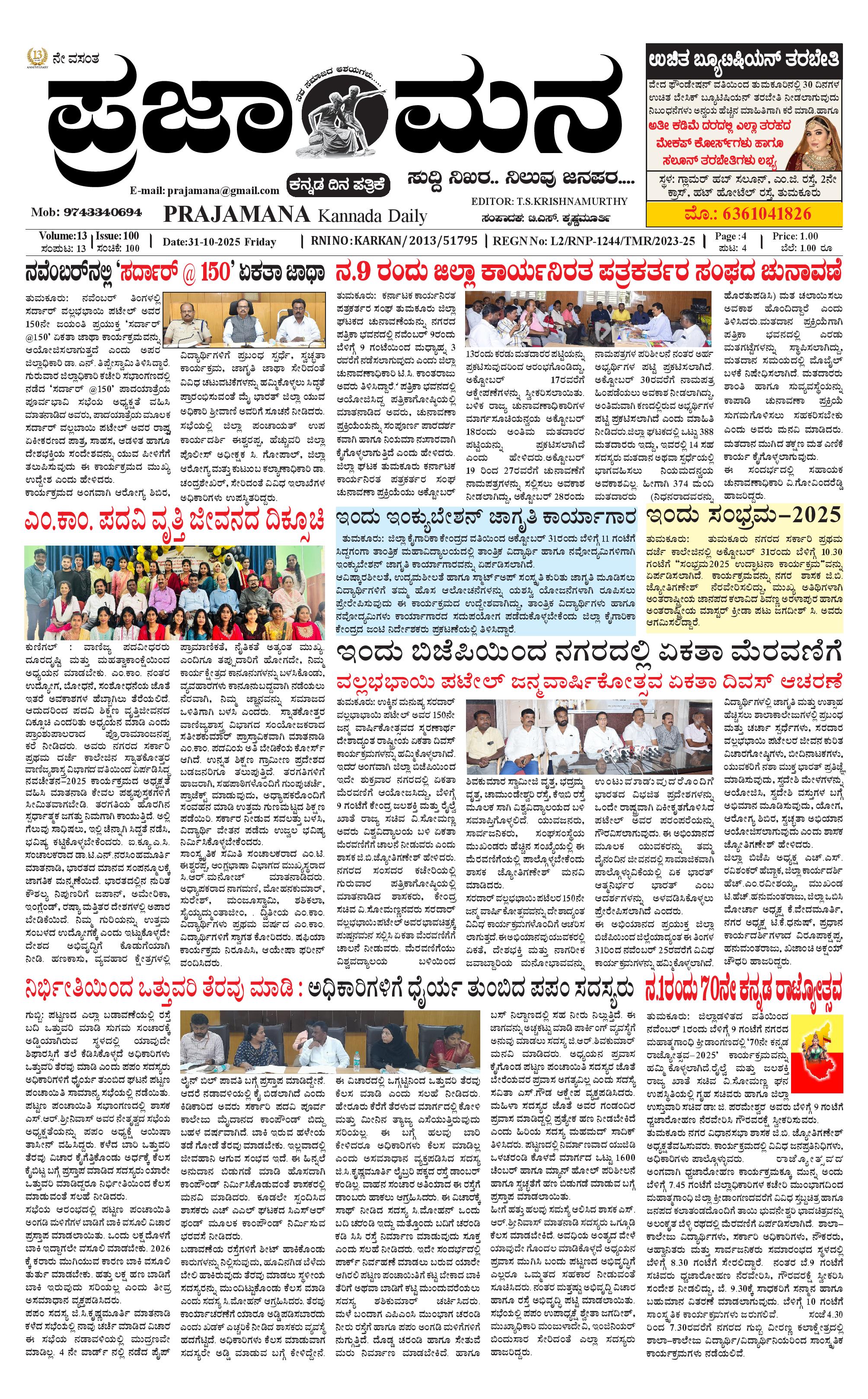 ಪ್ರಜಾಮನ 31 OCTOBER 2025 October 31, 2025 << First << 1 >> Last >> Page 1Page 2Page 3Page 4 × ಪ್ರಜಾಮನ 31 OCTOBER 2025 PRAJAMANA-page-001PRAJAMANA-page-002PRAJAMANA-page-003PRAJAMANA-page-004 << First << 1 >> Last >> PRAJAMANA-page-001PRAJAMANA-page-002PRAJAMANA-page-003PRAJAMANA-page-004 PRAJAMANA-page-001